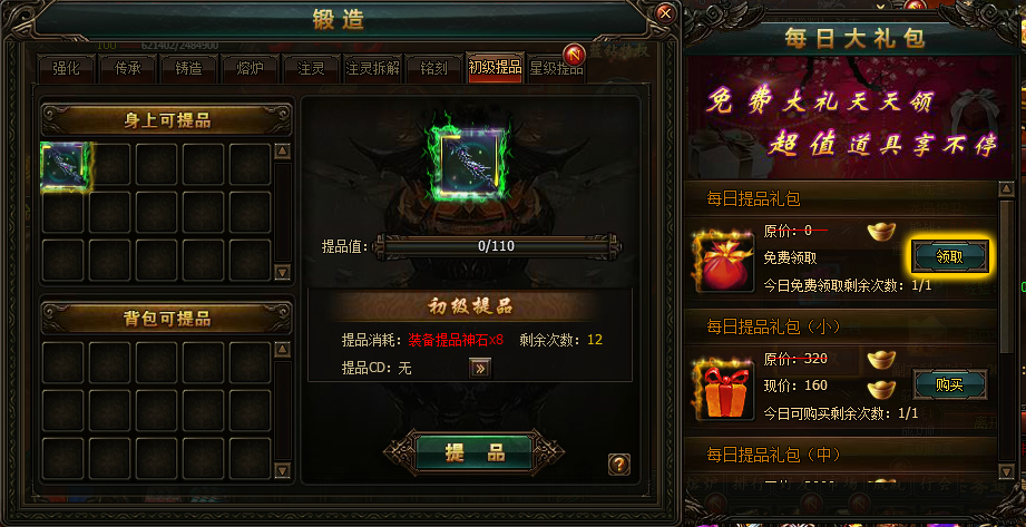 4:提品值达到50点以后可使用【星级提品】功能继续进行装备提品,提品值超过100点后将无法继续进行提品