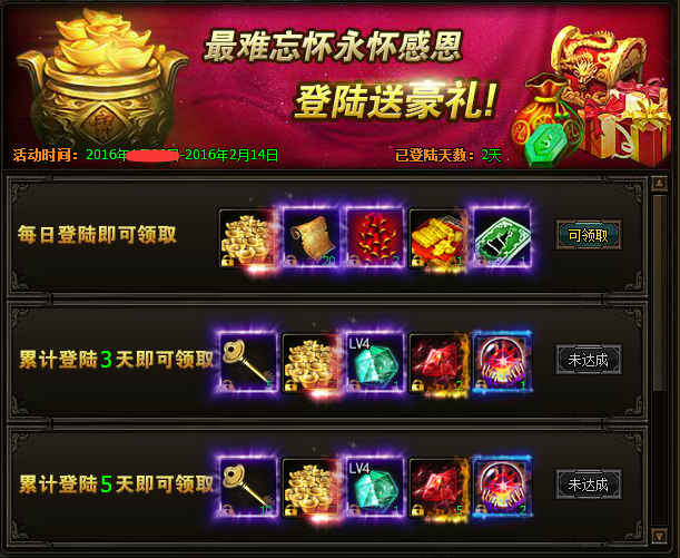 活动内容:活动期间,累计登录一定天数即可免费领取海量元宝、各种丰厚材料。更有特定新春称号“金猴迎春”领取。