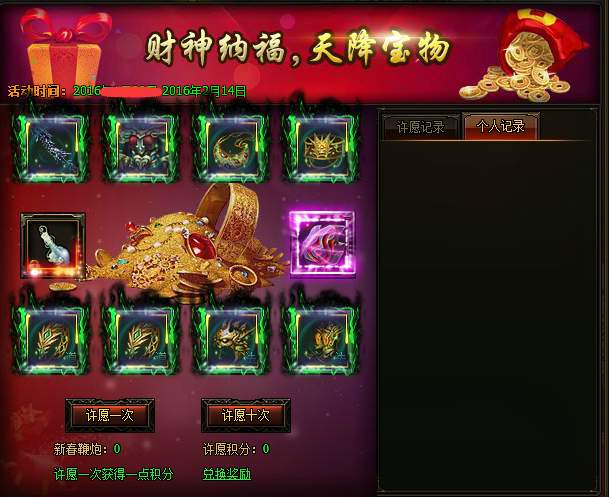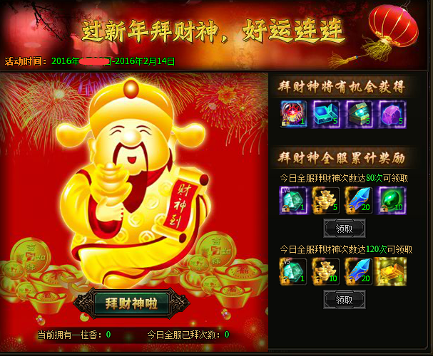 2、每日全服累计拜财神达到一定次数,全服玩家可领取丰厚元宝和珍稀道具奖励