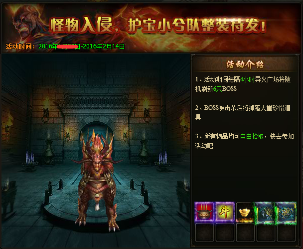 活动内容:活动期间,每隔4小时将有一批怪物邪灵入侵异火广场。前往守护击杀BOSS有几率掉落[圣者]极品装备、春节材料和珍稀道具。