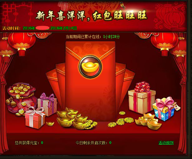活动内容:活动期间,每天累计在线4小时即可开启一次新年红包,可获得大量元宝奖励。